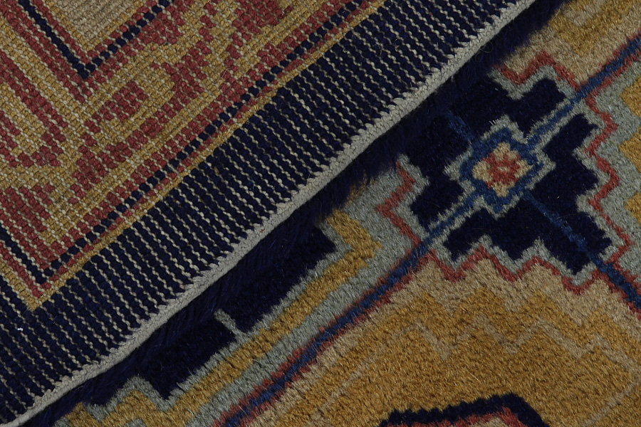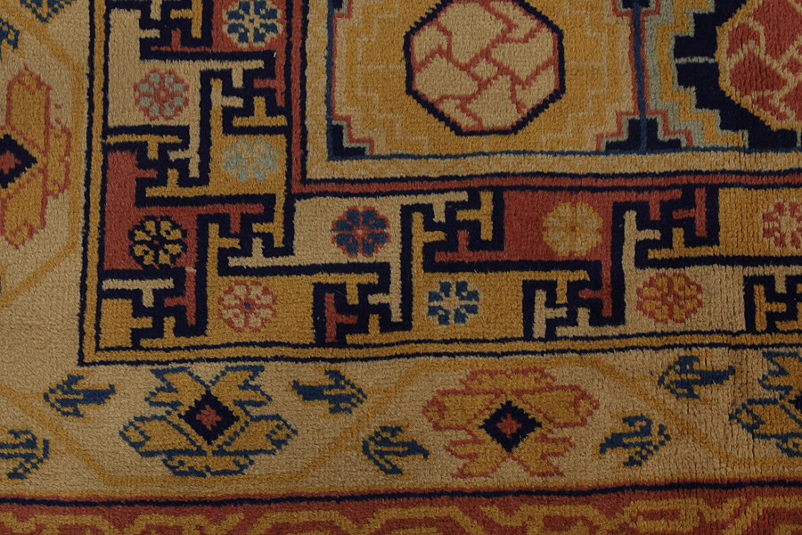 Khotan Carpets : Handwoven in or about the ancient city of Khotan (Hotan) in the southern Uygur Autonomous Region of Xinjiang (Chinese Turkistan). They combine Chinese details with Central Asian design schemes and Western vivid coloring, except where recent fugitive dyes have reduced their effect to washed-out pastels. Khotan carpets with woolen pile have cotton warp and mixed-color wool or cotton weft and are usually made with the asymmetrical knot. Field colors may be blue, yellow, or white, aswell as the usual red.