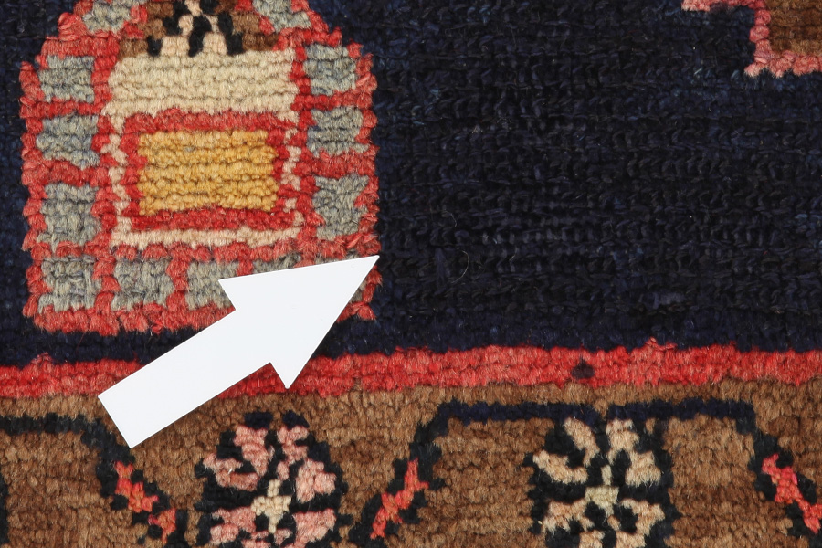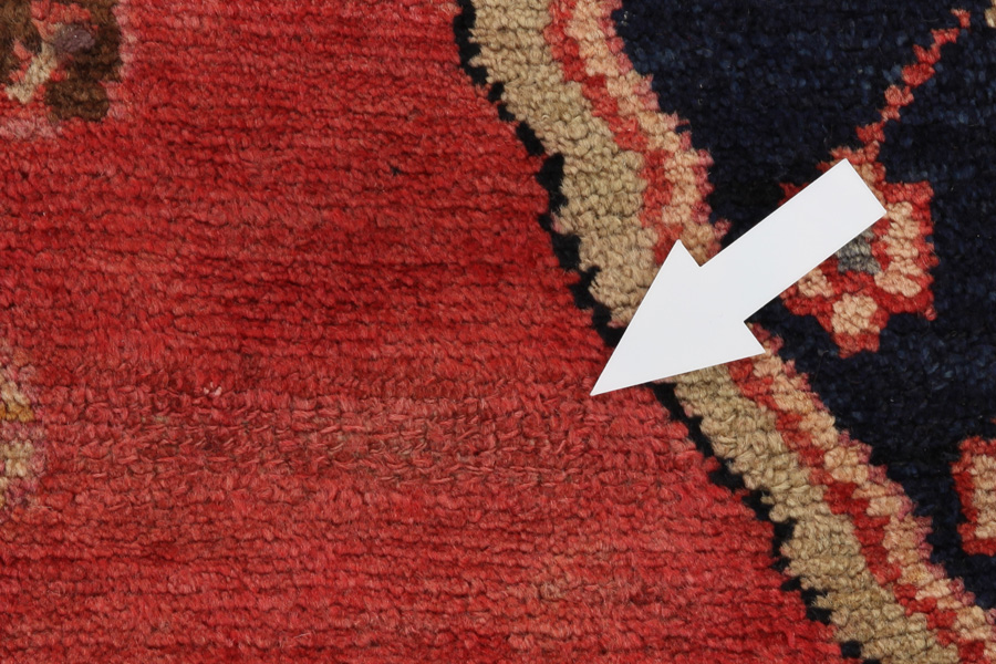 Abrash: Due to the different amount of grease in the wool and the added salt during the process of dyeing, the wool has got a varying colour absorbance. This is not very visible before weaving. During the weaving though, lines of the same colour are formed in the carpet. This is called Abrash (which in Farsi means little cloud) and it shows that the wool was not manufactured using chemical means and marks the naturalness and authenticity of the carpets. Examples