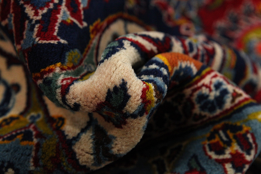 Abrash: Due to the different amount of grease in the wool and the added salt during the process of dyeing, the wool has got a varying colour absorbance. This is not very visible before weaving. During the weaving though, lines of the same colour are formed in the carpet. This is called Abrash (which in Farsi means little cloud) and it shows that the wool was not manufactured using chemical means and marks the naturalness and authenticity of the carpets. Examples