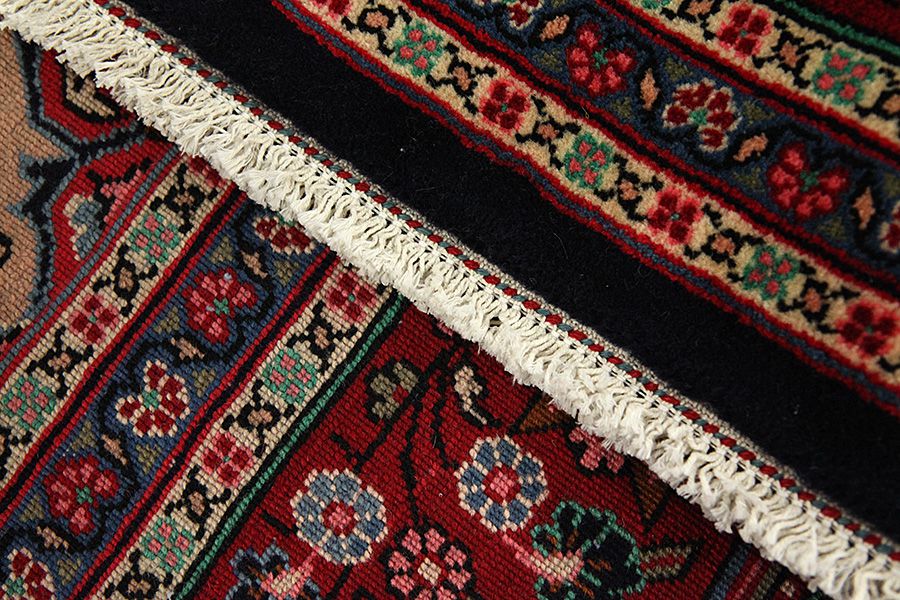 Abrash: Due to the different amount of grease in the wool and the added salt during the process of dyeing, the wool has got a varying colour absorbance. This is not very visible before weaving. During the weaving though, lines of the same colour are formed in the carpet. This is called Abrash (which in Farsi means little cloud) and it shows that the wool was not manufactured using chemical means and marks the naturalness and authenticity of the carpets. Examples