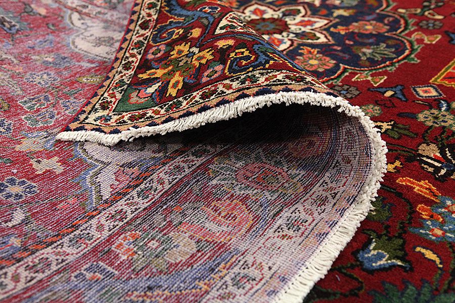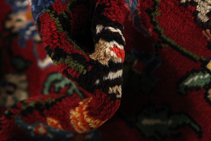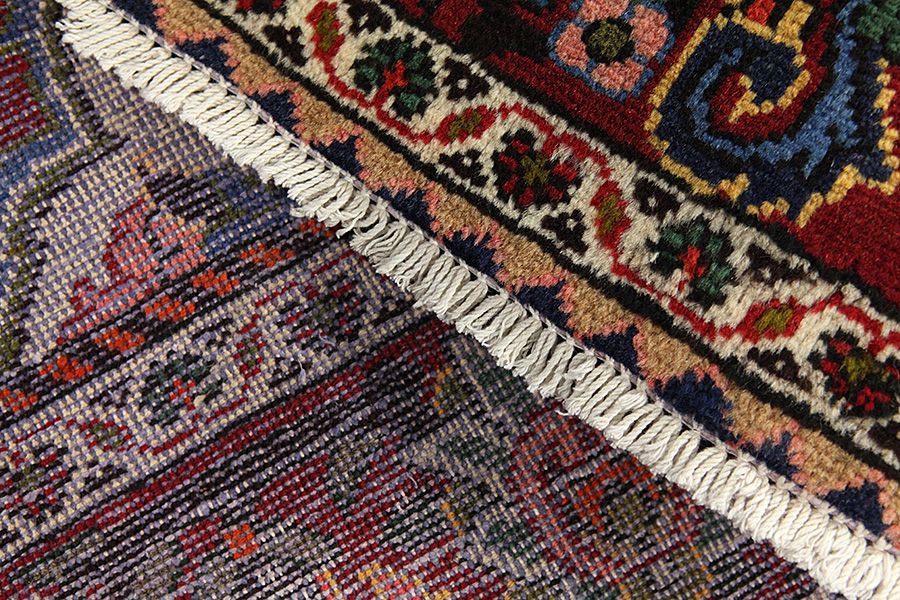 Abrash: Due to the different amount of grease in the wool and the added salt during the process of dyeing, the wool has got a varying colour absorbance. This is not very visible before weaving. During the weaving though, lines of the same colour are formed in the carpet. This is called Abrash (which in Farsi means little cloud) and it shows that the wool was not manufactured using chemical means and marks the naturalness and authenticity of the carpets. Examples