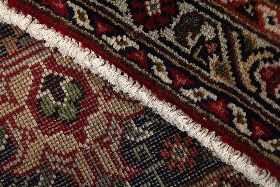Abrash: Due to the different amount of grease in the wool and the added salt during the process of dyeing, the wool has got a varying colour absorbance. This is not very visible before weaving. During the weaving though, lines of the same colour are formed in the carpet. This is called Abrash (which in Farsi means little cloud) and it shows that the wool was not manufactured using chemical means and marks the naturalness and authenticity of the carpets. Examples