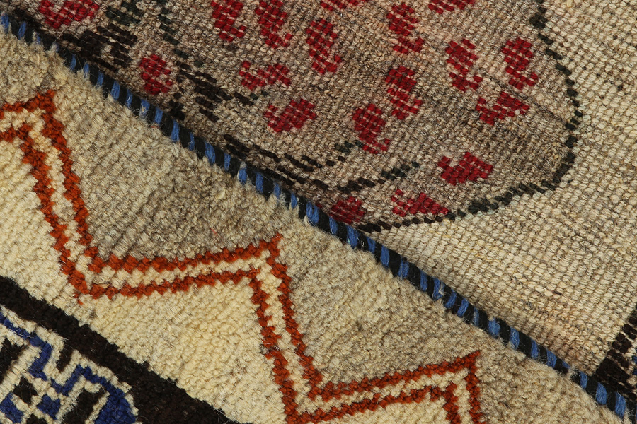Abrash: Due to the different amount of grease in the wool and the added salt during the process of dyeing, the wool has got a varying colour absorbance. This is not very visible before weaving. During the weaving though, lines of the same colour are formed in the carpet. This is called Abrash (which in Farsi means little cloud) and it shows that the wool was not manufactured using chemical means and marks the naturalness and authenticity of the carpets. Examples