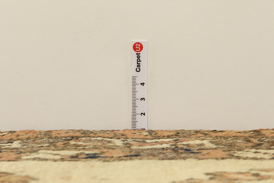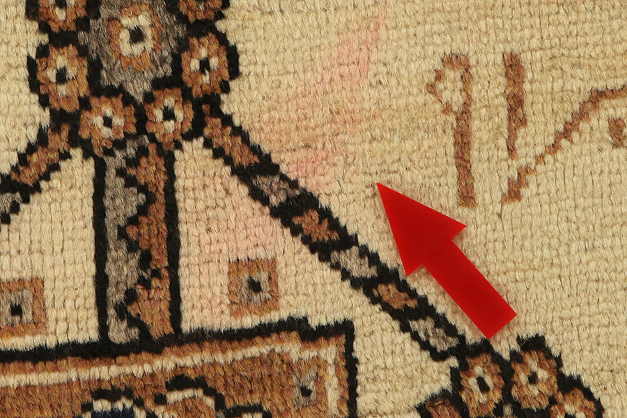 Abrash: Due to the different amount of grease in the wool and the added salt during the process of dyeing, the wool has got a varying colour absorbance. This is not very visible before weaving. During the weaving though, lines of the same colour are formed in the carpet. This is called Abrash (which in Farsi means little cloud) and it shows that the wool was not manufactured using chemical means and marks the naturalness and authenticity of the carpets. Examples