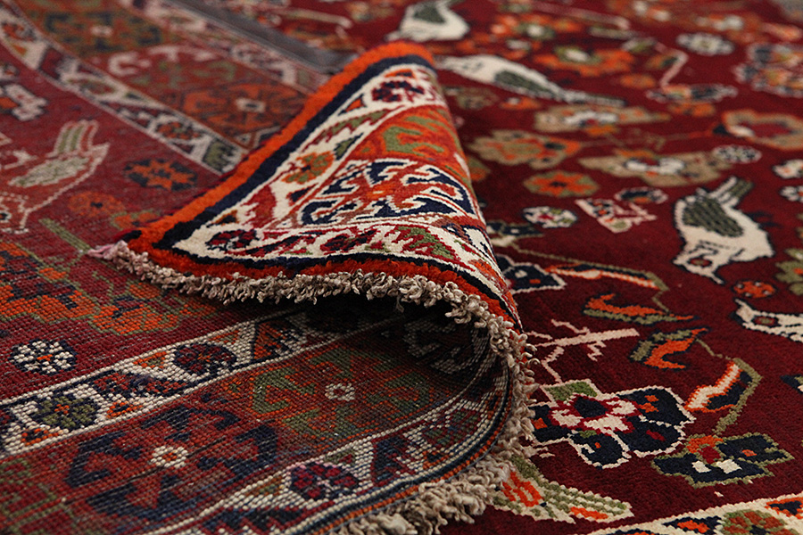 Qashqai Carpets : Qashqai carpets are woven by nomads who live in the mountainous areas of Southwest Persia, the provinces of Fars, Khuzestan, south of Isfahan and around the city Shiraz. Their carpets have a high knot density and a wide variety of designs, usually in deep red and blue colors. They weave carpets, Kilims and decorative textiles (ribbons, bags, etc.), which depict scenes from their lives with various representation of humans, animals, birds, trees and flowers. They also depict historical monuments, mostly from Persepolis.