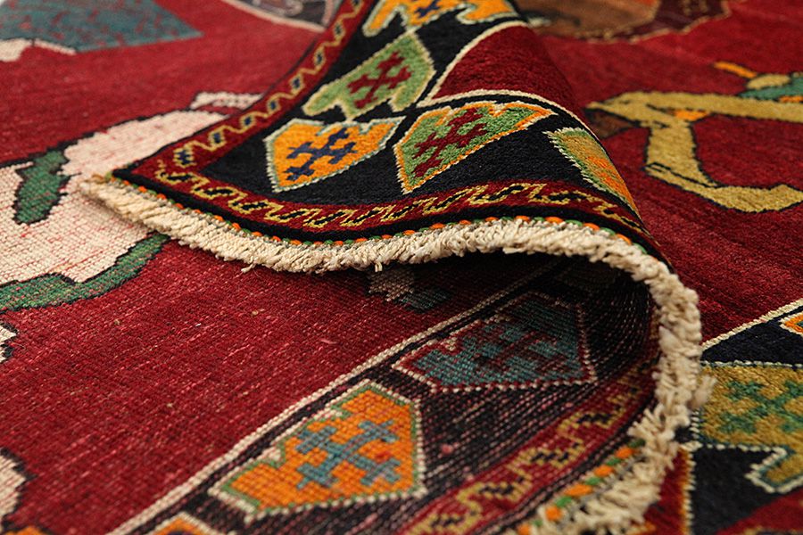 Qashqai Carpets : Qashqai carpets are woven by nomads who live in the mountainous areas of Southwest Persia, the provinces of Fars, Khuzestan, south of Isfahan and around the city Shiraz. Their carpets have a high knot density and a wide variety of designs, usually in deep red and blue colors. They weave carpets, Kilims and decorative textiles (ribbons, bags, etc.), which depict scenes from their lives with various representation of humans, animals, birds, trees and flowers. They also depict historical monuments, mostly from Persepolis.