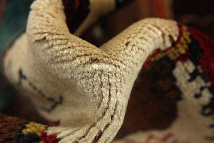 Abrash: Due to the different amount of grease in the wool and the added salt during the process of dyeing, the wool has got a varying colour absorbance. This is not very visible before weaving. During the weaving though, lines of the same colour are formed in the carpet. This is called Abrash (which in Farsi means little cloud) and it shows that the wool was not manufactured using chemical means and marks the naturalness and authenticity of the carpets. Examples
