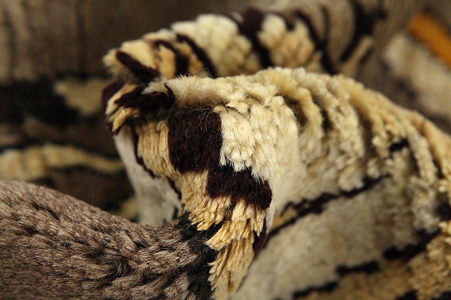 Abrash: Due to the different amount of grease in the wool and the added salt during the process of dyeing, the wool has got a varying colour absorbance. This is not very visible before weaving. During the weaving though, lines of the same colour are formed in the carpet. This is called Abrash (which in Farsi means little cloud) and it shows that the wool was not manufactured using chemical means and marks the naturalness and authenticity of the carpets. Examples