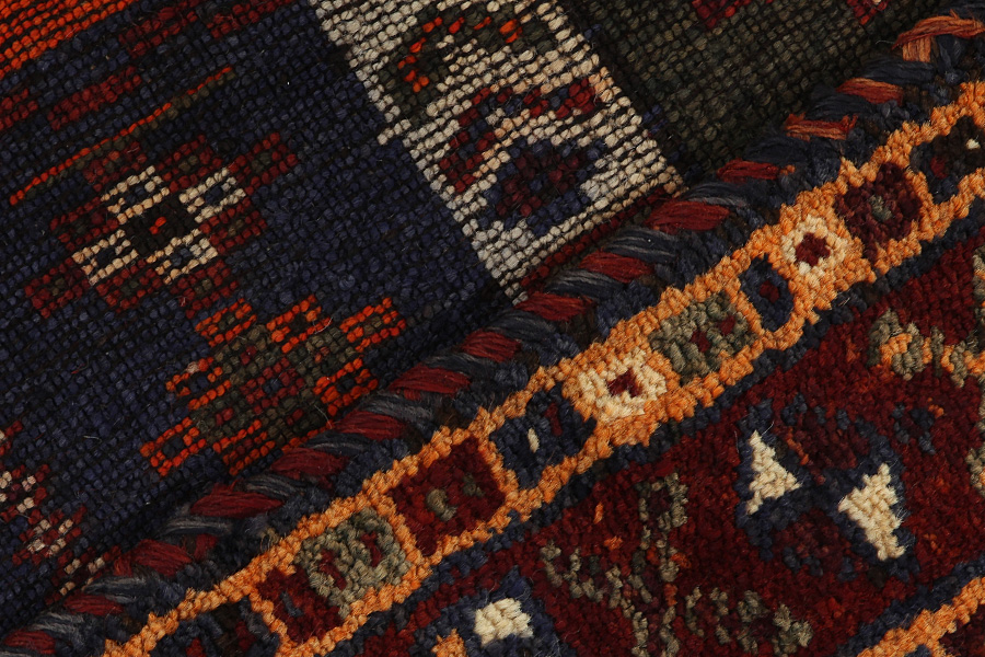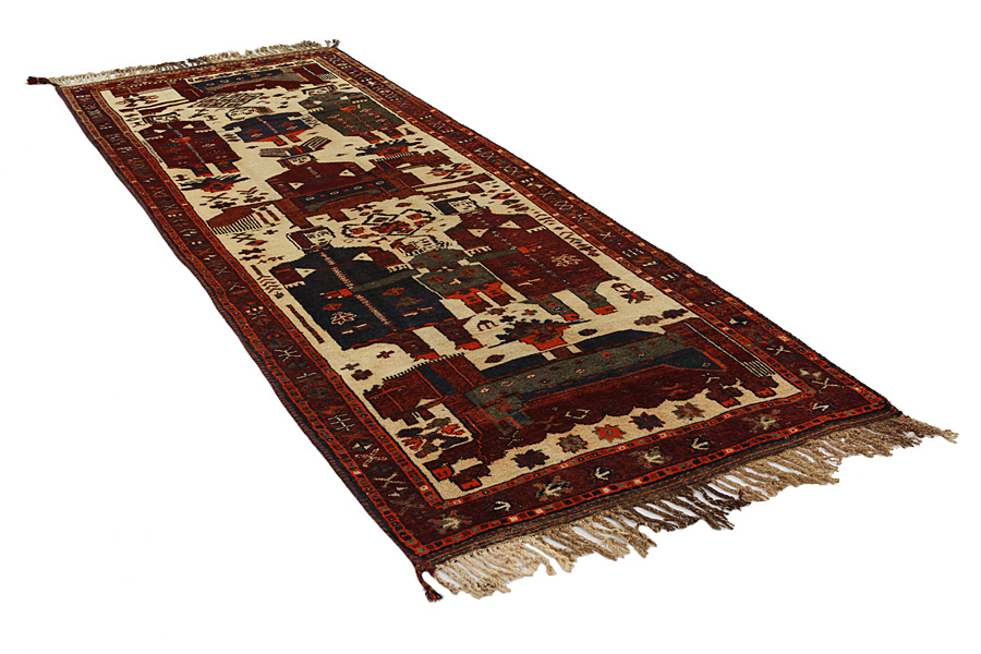 Qashqai Carpets : Qashqai carpets are woven by nomads who live in the mountainous areas of Southwest Persia, the provinces of Fars, Khuzestan, south of Isfahan and around the city Shiraz. Their carpets have a high knot density and a wide variety of designs, usually in deep red and blue colors. They weave carpets, Kilims and decorative textiles (ribbons, bags, etc.), which depict scenes from their lives with various representation of humans, animals, birds, trees and flowers. They also depict historical monuments, mostly from Persepolis.