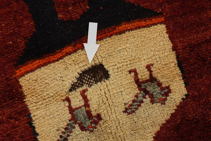 Abrash: Due to the different amount of grease in the wool and the added salt during the process of dyeing, the wool has got a varying colour absorbance. This is not very visible before weaving. During the weaving though, lines of the same colour are formed in the carpet. This is called Abrash (which in Farsi means little cloud) and it shows that the wool was not manufactured using chemical means and marks the naturalness and authenticity of the carpets. Examples