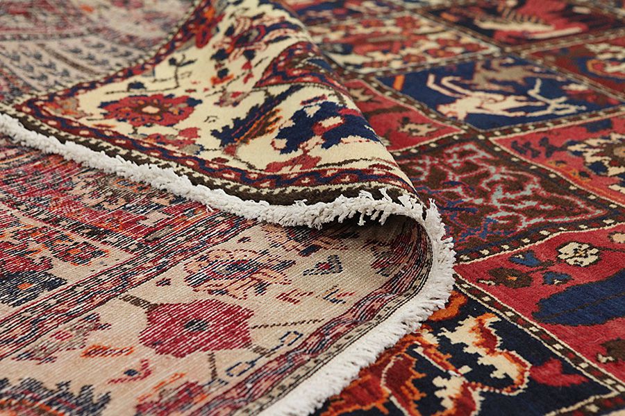 Bakhtiari Carpets : In the mountains Zagros, west of the city of Isfahan, around the town of Shahr-e-Kurd, live the nomads Bakhtiar. Their carpets are known for the design with various repeating squares in which flowers and animals are depicted. For this reason the design is called "garden"(Khesti). Their carpets are very durable with a dense weave and very good quality Persian wool coming from sheep grazing at a high altitude. The best Bakhtiar rugs and carpets with highest knot density are often called Bibibaff. Also in many designs we see influences from Isfahan carpets. (Boldaji - Feridan - Saman).