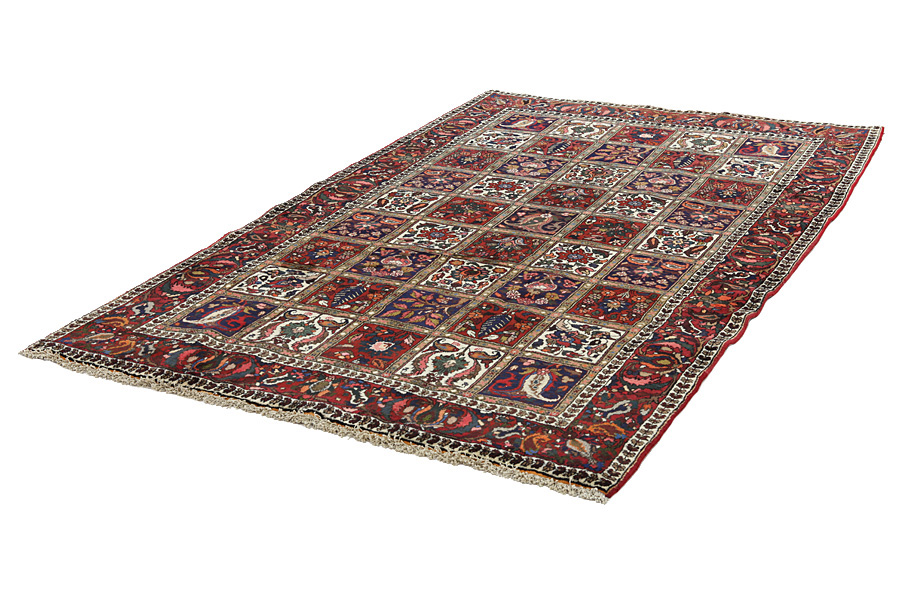 Bakhtiari Carpets : In the mountains Zagros, west of the city of Isfahan, around the town of Shahr-e-Kurd, live the nomads Bakhtiar. Their carpets are known for the design with various repeating squares in which flowers and animals are depicted. For this reason the design is called "garden"(Khesti). Their carpets are very durable with a dense weave and very good quality Persian wool coming from sheep grazing at a high altitude. The best Bakhtiar rugs and carpets with highest knot density are often called Bibibaff. Also in many designs we see influences from Isfahan carpets. (Boldaji - Feridan - Saman).