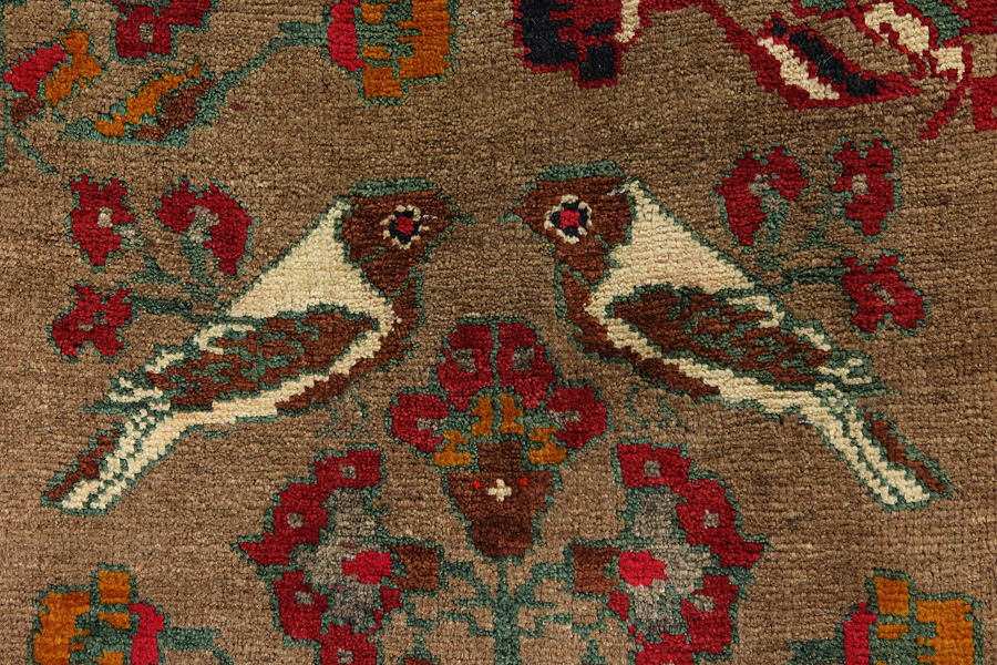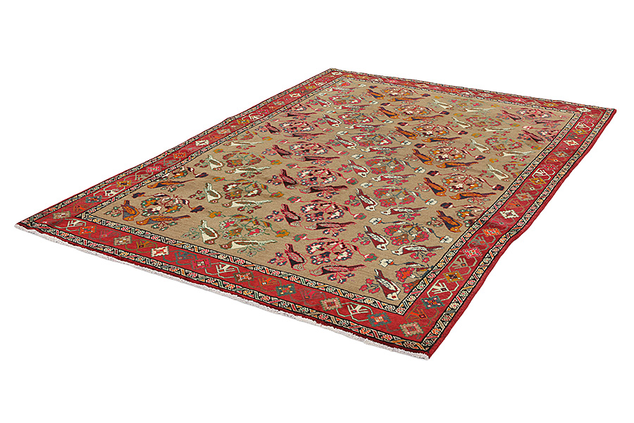 Qashqai Carpets : Qashqai carpets are woven by nomads who live in the mountainous areas of Southwest Persia, the provinces of Fars, Khuzestan, south of Isfahan and around the city Shiraz. Their carpets have a high knot density and a wide variety of designs, usually in deep red and blue colors. They weave carpets, Kilims and decorative textiles (ribbons, bags, etc.), which depict scenes from their lives with various representation of humans, animals, birds, trees and flowers. They also depict historical monuments, mostly from Persepolis.