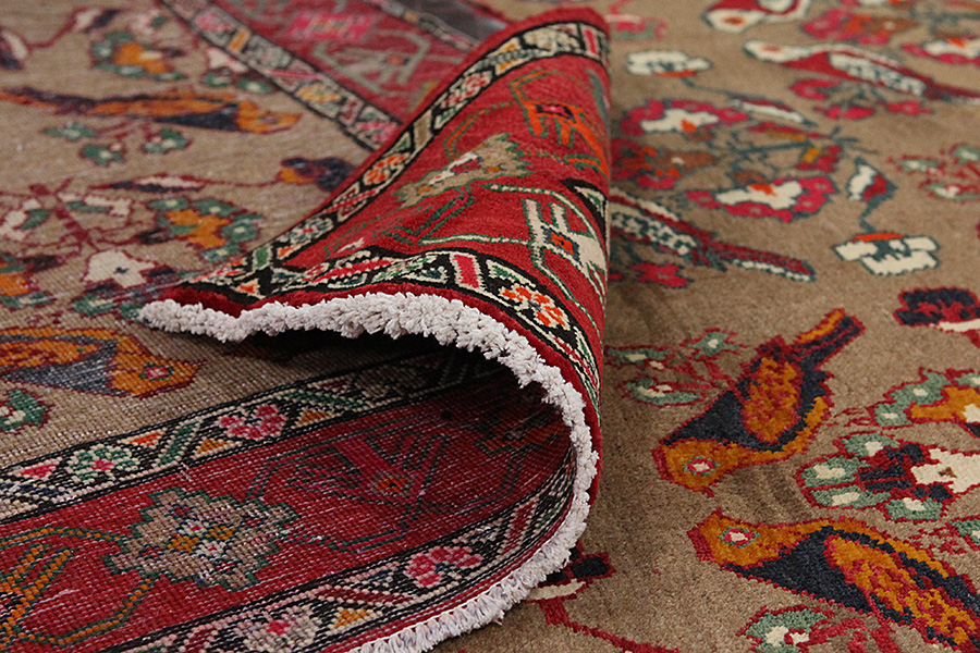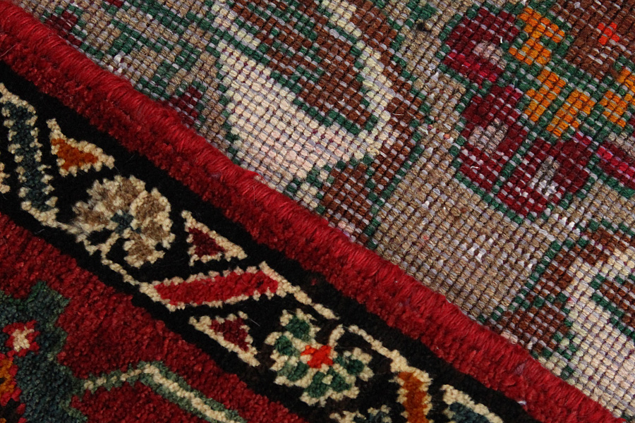 Abrash: Due to the different amount of grease in the wool and the added salt during the process of dyeing, the wool has got a varying colour absorbance. This is not very visible before weaving. During the weaving though, lines of the same colour are formed in the carpet. This is called Abrash (which in Farsi means little cloud) and it shows that the wool was not manufactured using chemical means and marks the naturalness and authenticity of the carpets. Examples